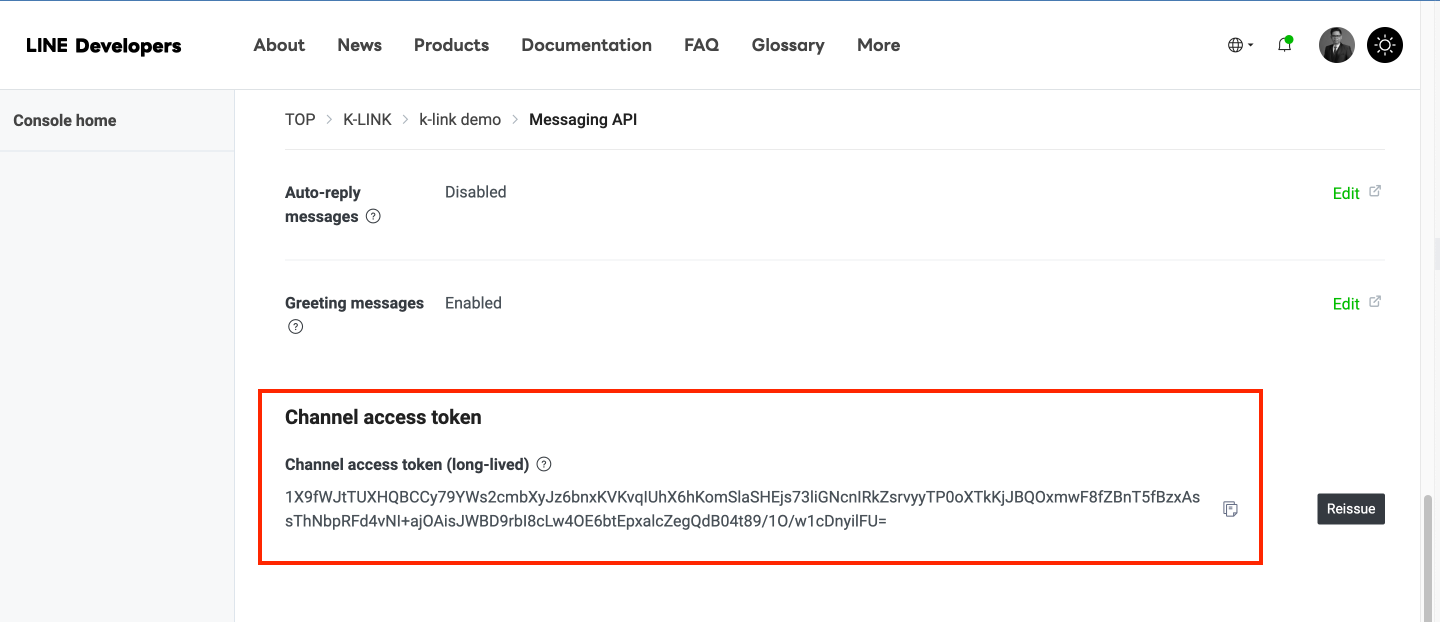 Get your Channel Access Token by going to your LINE Developer Account > Provider Name > Messaging API > Scroll all the way down