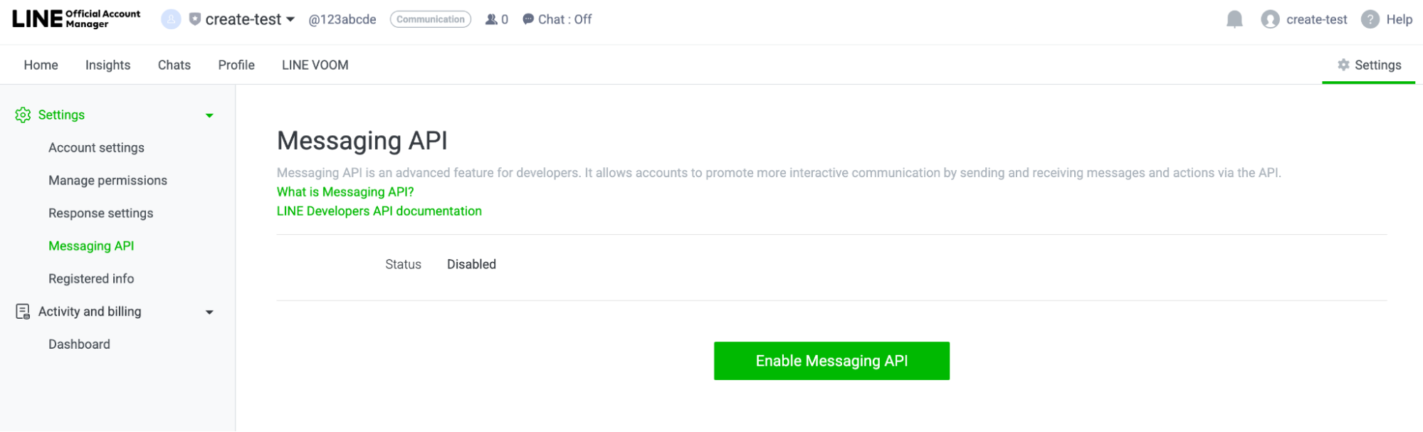 Now go back to your LINE Official Account Manager. In the top right corner, click on “Setting”. Then, on the left panel, select “Messaging API” and “Enable Messaging API”. Be sure to select the provider mentioned previously.