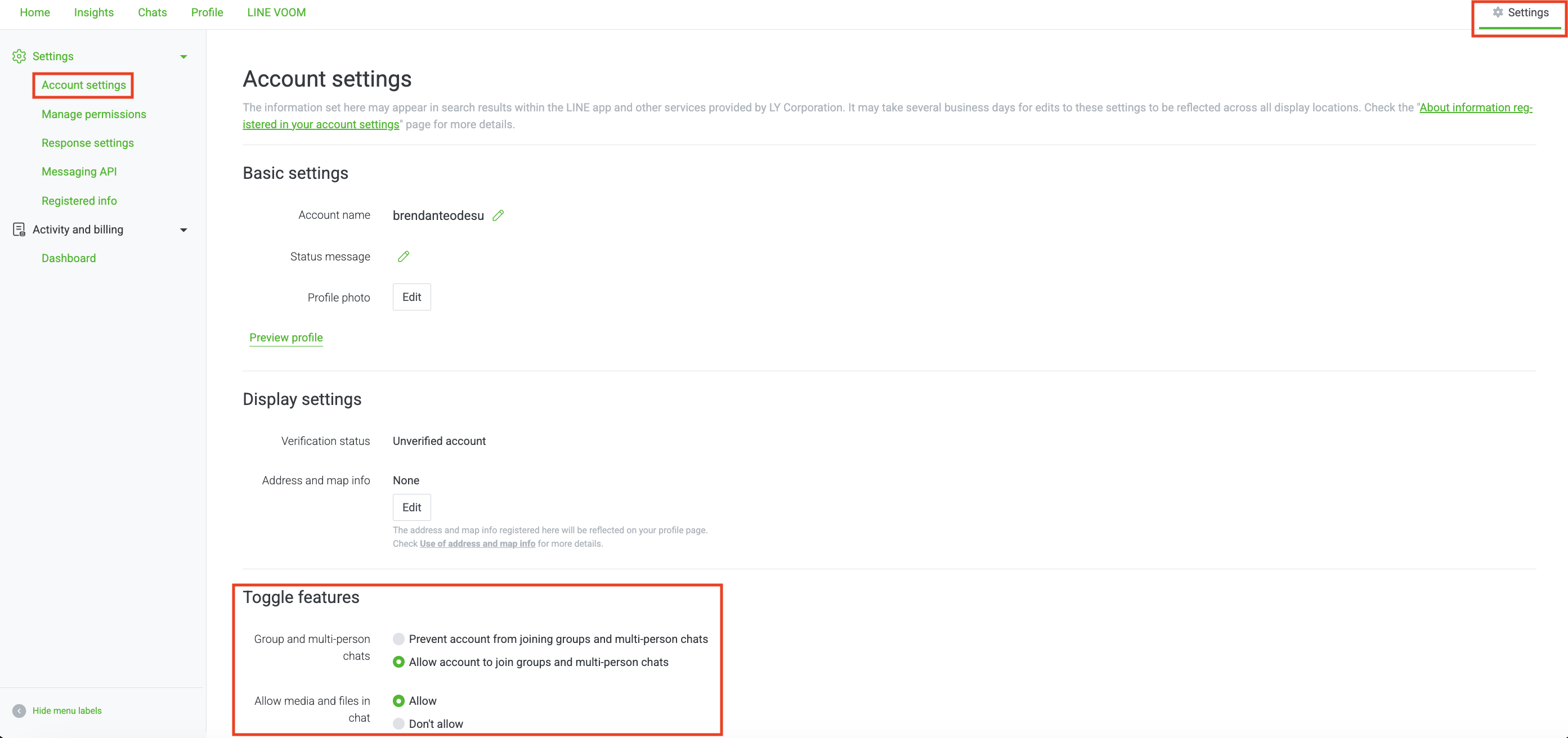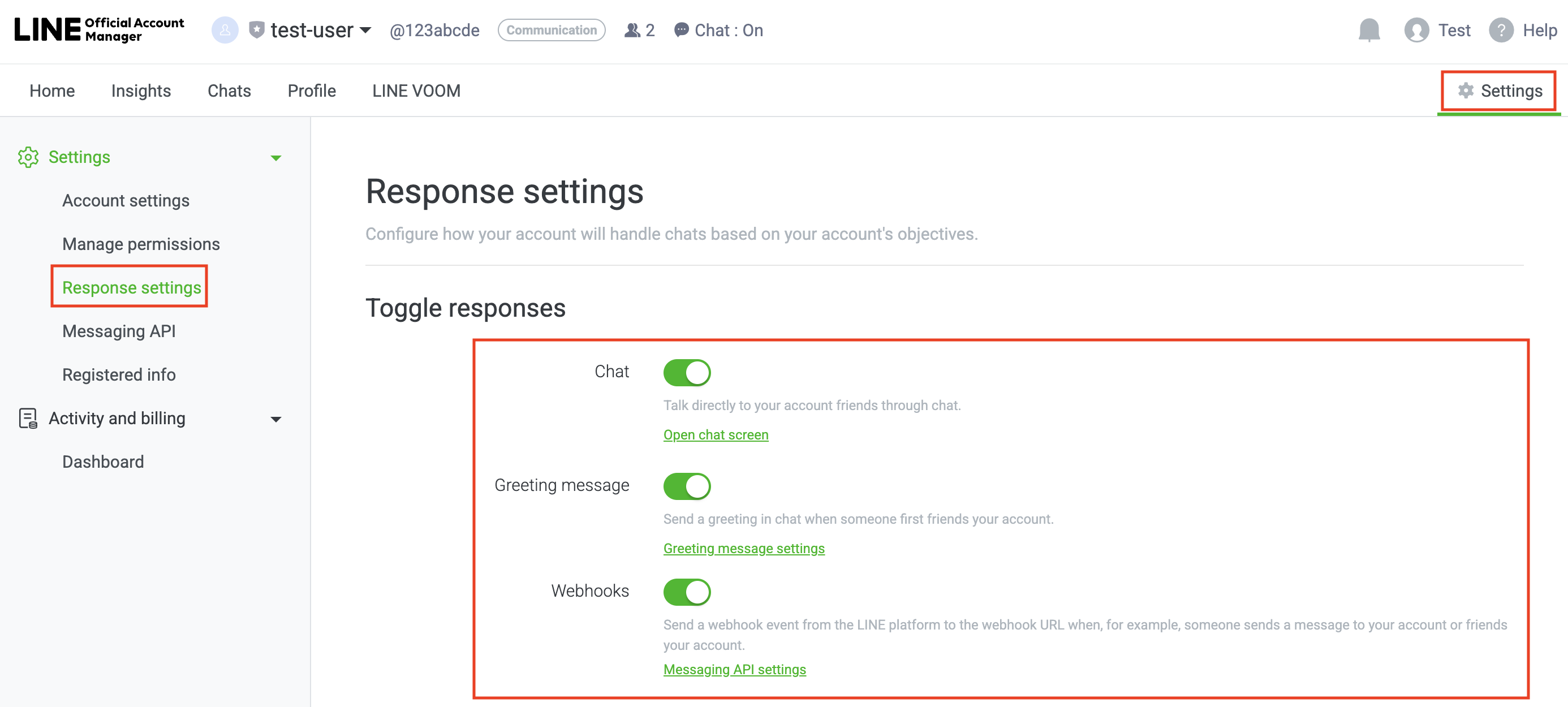 Enable Chatbot Settings by going to your LINE Official Account Manager > Settings(Top Right) > Response Settings