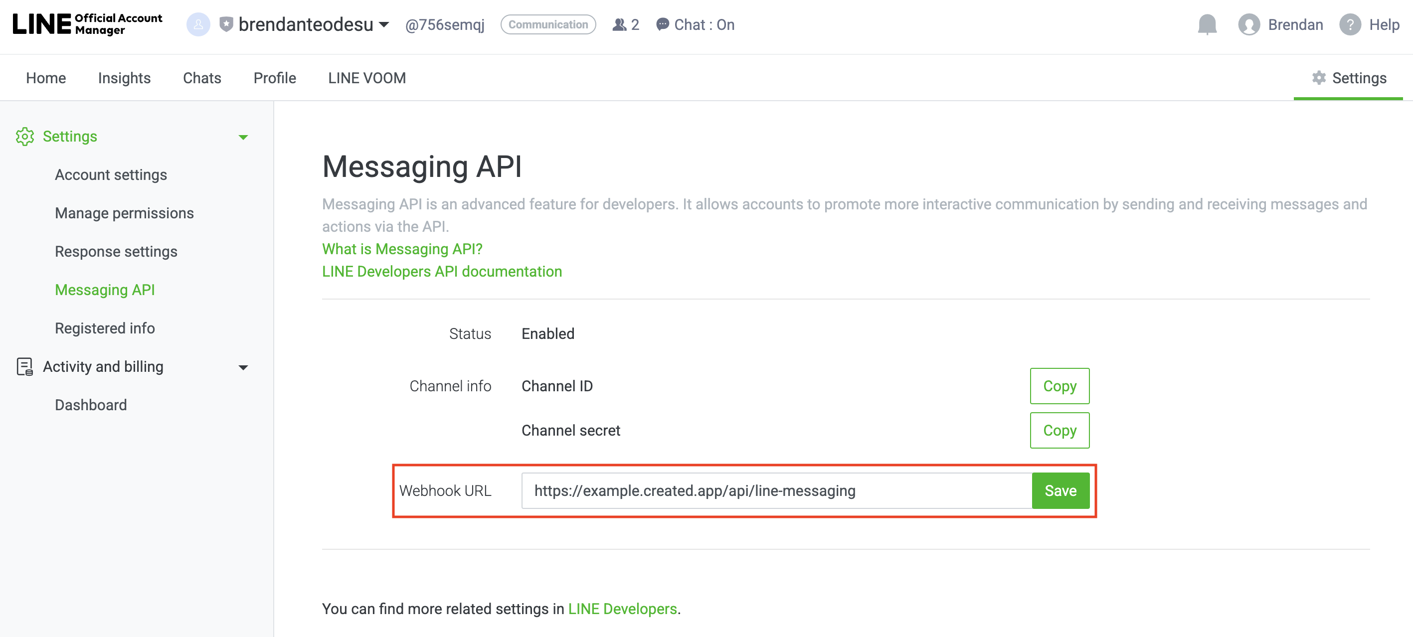 Input your webhook URL in your LINE Official Account Manager. It should be in the format of https:// your-anything-project-url.created.app/api/line-messaging.