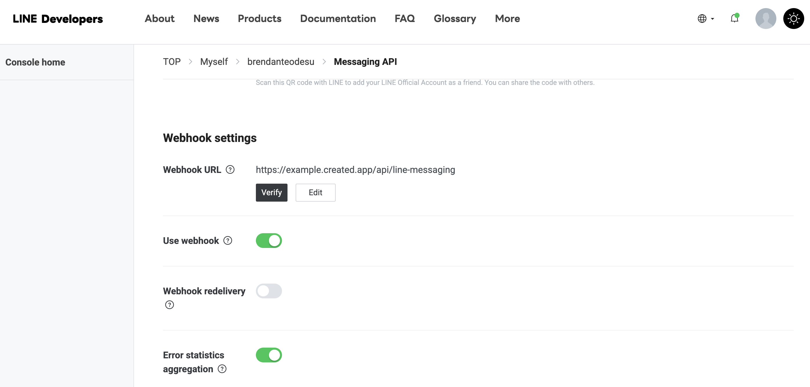 After publishing your project, you may verify your webhook URL by going to your LINE Developer Console > Provider > Channel > Messaging API
